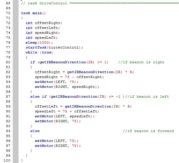 The Krimzon Guard Security Tank is programmed in RobotC (my first robot to be programmed this way). It runs one program, but the program runs two completely independent tasks, so for convenience, I gave each task its own section. The first task is called “driveControl.”This task is a proportional beacon follower that uses the LEGO IR sensor and controls the two drive motors, essentially telling the robot where to drive. The program works as follows: if the beacon is to the left, the robot turns left, and if the beacon is right, the robot turns right. Here is where the proportional part comes in: the IR sensor measures how far away the angle of the IR Beacon is from being directly ahead; the farther away from the middle the beacon is, the sharper a turn the robot will make (by way of some math calculations). So, if the beacon is just a little off center, the robot will make a slight turn, but if the beacon is all the way at the edge of the IR sensor’s vision, the robot will make a spin turn. The sharpness of the turn is completely variable in between. I have a picture of the proportional beacon follower here.