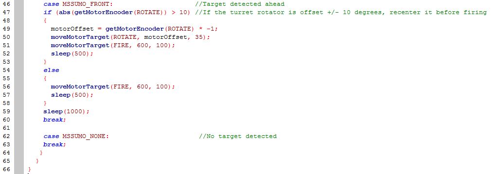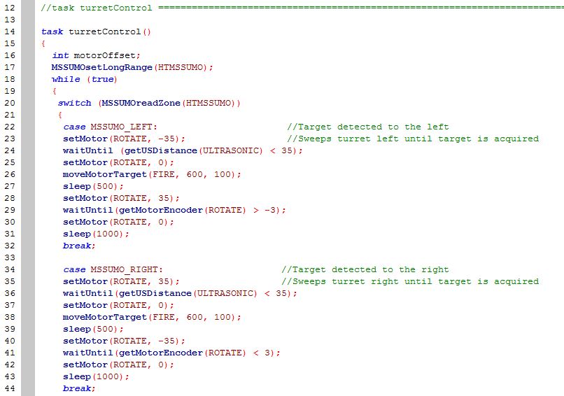 The second task in the program is “turretControl,” which uses the SumoEyes and the Ultrasonic sensor to control the rotation and firing of the turret. (Remember, these are two tasks that are independent of one another but run simultaneously in the same program). First, the SumoEyes spots a target and tells the EV3 which zone it is in (left, right or straight ahead). If the target is in the right zone, the turret will rotate right until the Ultrasonic sensor sees the target, too. Then, the robot fires two shots at the target and the turret returns to center to repeat the process with another target. If the object is left, the robot executes the same process as the right, just in the left direction. If the target is straight ahead, the robot will check to see if the turret is centered; if it isn’t, it will center the turret and then fire when the Ultrasonic sensor sees the target; if the turret is already centered, it skips the centering step. This all makes for a pretty advanced targeting system that locks onto targets and hits them with good accuracy.