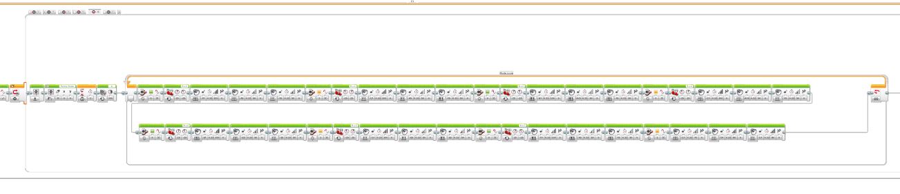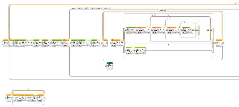 The majority o the updates are to the programming (pic 1). As DamonMM2000 pointed out in his review, the main problem with the T5.5’s program was exiting modes; as you may recall, all 5 of the Timmyton’s operating modes are accessed through a menu in the single program, and can be entered/exited without leaving the program. In the 5.5, exiting modes to go back to the Timmyton menu was sloppy, difficult and often didn’t work right. The reason for this was that some of the operating modes used multiple simultaneous loops, which all needed to be exited in order to exit the modes. So, the first thing that was done was the modes that used multiple loops were restructured to use one just loop (see the next step, Funky Mode for more on this). Next, all of the loop blocks within the modes were renamed to all have the same name; “Mode Loop.” Finally, a new parallel branch was added underneath the program; this is the interrupt case (pic 2). It constantly monitors the condition of the center brick button; if it is pressed, it will end all loops named “Mode Loop,” which ends all functions of that mode and returns to the menu. Now, the exiting of modes is easier, cleaner, requires just one button press and does not crash or accidentally select an unwanted mode, as in the T5.5. Thus, the 5.6 is now easier and more streamlined for anyone to operate.